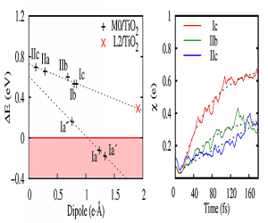 計(jì)算結(jié)果表明這種新提出的通過氰基和羧基共吸附、含有Ti-N鍵的表面構(gòu)型在能量上最穩(wěn)定(圖1)。這改變了人們的普遍認(rèn)識(shí):氰基在吸附中起到關(guān)鍵作用,它對(duì)界面穩(wěn)定性、電化學(xué)性質(zhì)的影響往往被忽視。通過電子結(jié)構(gòu)計(jì)算和激發(fā)態(tài)電子動(dòng)力學(xué)模擬,他們進(jìn)一步研究了這種新提出的吸附構(gòu)型中染料分子和表面的電子耦合,能級(jí)相對(duì)位置,以及它們對(duì)太陽(yáng)能電池電壓及電流的影響。光激發(fā)電子從染料分子向TiO2表面注入的動(dòng)態(tài)過程表明新構(gòu)型有利于電子的快速注入并有著高量子效率,在電子結(jié)構(gòu)上則更有利于產(chǎn)生較高的工作電壓(圖3),從而保證此類太陽(yáng)能電池具有較高的能量轉(zhuǎn)化效率(~10%)。這些工作在原子尺度上建立了界面能源轉(zhuǎn)化機(jī)制中微觀結(jié)構(gòu)與宏觀性能的關(guān)系,對(duì)進(jìn)一步從微觀上調(diào)控、優(yōu)化和提高太陽(yáng)能轉(zhuǎn)化效率提供了新的辦法。相關(guān)結(jié)果發(fā)表在【Advanced Functional Materials(IF=10),DOI: 10.1002/adfm.201201831】上。