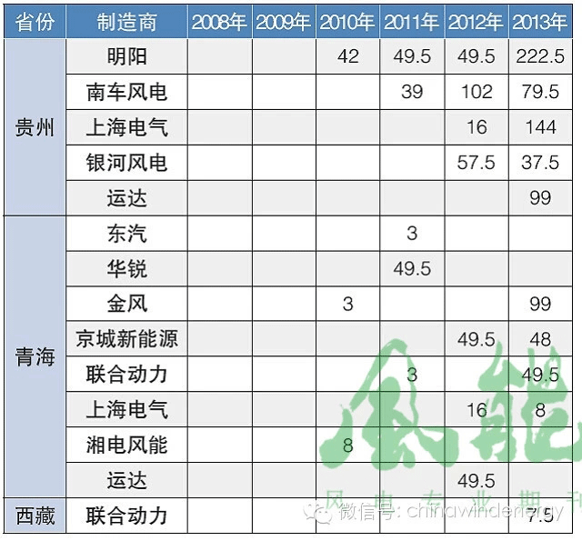 歷年在高海拔地區(qū)有新增裝機的整機商數(shù)量,除2009年比2008年少了1家外,整體上處于不斷增加的趨勢。整機商數(shù)量最高時的2012年和2013年均為13家。2013年在高海拔地區(qū)有裝機的整機商數(shù)量是當年在中國有風(fēng)電裝機的整機商數(shù)量的43.33%。