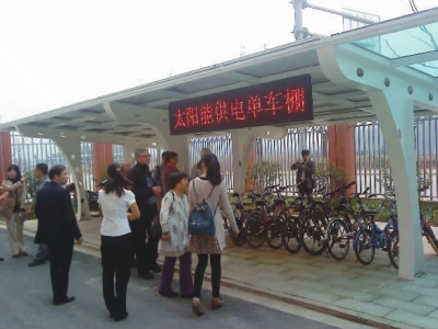 位于兩型示范建設地帶的梅溪湖長郡中學,于2012年9月安裝了太陽能供電單車棚。學??倓仗幹魅蚊C窠榻B,發(fā)電系統(tǒng)功率為15千瓦,每天可以發(fā)電180度甚至更多。因為學校有200多盞40瓦的路燈,每天從晚6點到早6點照明耗電180度,如果是傳統(tǒng)用電,每年電費為2萬多?,F(xiàn)在完全是靠太陽能系統(tǒng)來供電,此外,該系統(tǒng)還能滿足一些電動車的充電需求。