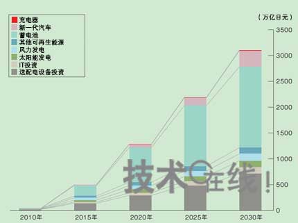 其中對制造業(yè)尤其具有吸引力的是能源領(lǐng)域。太陽能發(fā)電等可再生能源和以電動汽車(EV)為首的新一代汽車等低碳型產(chǎn)品將會大量導入。隨之而來的將是為確保系統(tǒng)電網(wǎng)穩(wěn)定的蓄電池和送配電網(wǎng)市場的擴大。日經(jīng)BP社環(huán)境類智囊團——日經(jīng)BP CleanTech Institute調(diào)查了100個主要的智能城市項目,基于此對蓄電池和新一代汽車等要素逐個進行預測的結(jié)果表明,智能城市的市場規(guī)模在2030年累計將達3100萬億日元(圖2)。