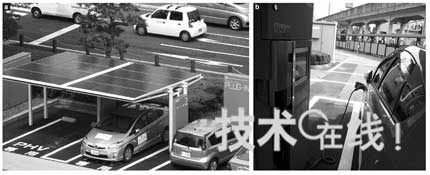 圖3:豐田市市政府用地內(nèi)先行設(shè)置的充電站的全景(a)和充電時的情形(b)(日經(jīng)BP CleanTech Institute) |