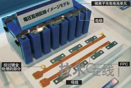 日本NOK展出的是嵌入鋰離子充電電池的柔性印刷底板(FPC)“電壓監(jiān)控布線用FPC”(圖3)。鋰離子充電電池由電池管理單元(BMU)對(duì)各電池單元的功能及安全性進(jìn)行管理。這種FPC是能夠用電信號(hào)將各個(gè)電池單元連接至BMU,并利用BMU檢測(cè)出電池單元電壓的部件。