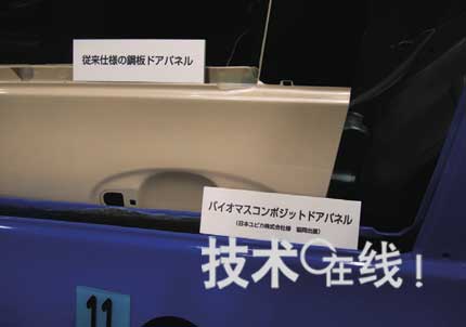 日本杰斯比(JSP)和優(yōu)必佳(U-PICA)展出了采用經(jīng)過(guò)玻璃纖維強(qiáng)化處理的植物性樹(shù)脂(植物性FRP)和植物性發(fā)泡芯材相結(jié)合的“復(fù)合板”制成的汽車(chē)車(chē)門(mén)板(圖2)。包含玻璃窗在內(nèi),這種復(fù)合板車(chē)門(mén)約重21kg,比約28kg的鋼板車(chē)門(mén)輕7kg。還有望提高隔熱性、吸音性及沖擊吸收性等性能。