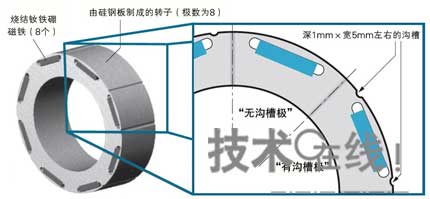 轉(zhuǎn)子為8極,轉(zhuǎn)子上插入了8個(gè)這種磁鐵。如果第1極沒(méi)有溝槽,則第3、5、7極也沒(méi)有溝槽,而在第2、4、6、8極設(shè)有溝槽。具體而言,就是在轉(zhuǎn)子外周上正好相當(dāng)于磁鐵兩端附近之處,加工深1mm×寬5mm左右的小溝槽。因此,各個(gè)“有溝槽極”上分別設(shè)有兩個(gè)溝槽。