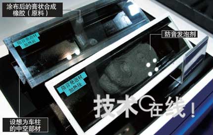 涂布的對(duì)象位置為車(chē)柱(A~C柱)內(nèi)部等。由于這些部位的截面為箱狀(中空),因此車(chē)輛行駛時(shí)會(huì)因風(fēng)灌入而產(chǎn)生風(fēng)切音。對(duì)此,可將防音發(fā)泡劑填入車(chē)柱內(nèi)部,通過(guò)切斷氣流來(lái)減小風(fēng)切音。此外,為了防止汽車(chē)產(chǎn)生路面噪聲、輪胎噪聲以及石子飛濺的聲音,盛勢(shì)達(dá)還考慮將這種發(fā)泡劑應(yīng)用于輪罩拱(Wheel Arch))及地板下方等。其隔音效果為30dB左右。