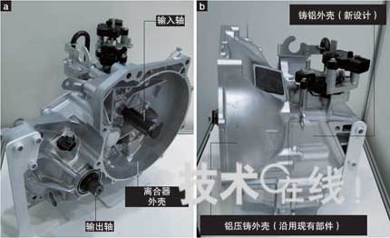 圖8:驅(qū)動(dòng)用馬達(dá)減速機(jī)(富士機(jī)械) 已配備于斯巴魯Plugin Stella。屬于兩檔減速型,輸入軸與馬達(dá)軸連接。內(nèi)部有中間軸(照片上看不到),輸出軸與車(chē)輪端相連(a)。鋁壓鑄離合器殼體沿用了現(xiàn)有部件。殼體蓋為新制造,由模具費(fèi)用比鋁壓鑄品低的鋁鑄造品制成(b)。 |