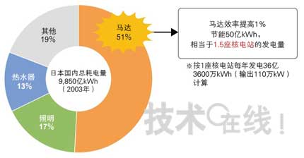 新式馬達(dá)最有望在節(jié)能方面收到廣泛的效果。有試算結(jié)果表明,馬達(dá)的耗電占到日本國內(nèi)總耗電量9850億kWh的51%(圖2)。如果馬達(dá)驅(qū)動(dòng)的機(jī)器效率能提高1%,則可節(jié)約1.5座核電站的發(fā)電量。