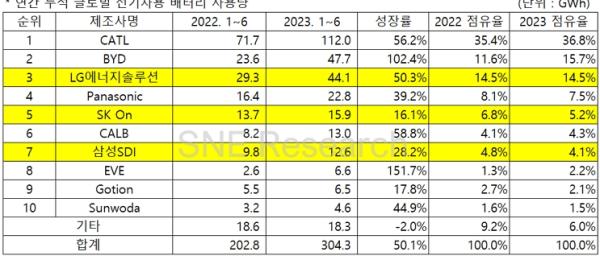 相較而言,2023年1—6月韓國三家公司LG新能源、三星SDI和SK on 市場占有率23.9%,比去年同期下降了2.2個(gè)百分點(diǎn),但三家公司的電池裝車量均呈現(xiàn)增長趨勢。LG能源44.1GWH與去年同期相比增長50.3%,排在第三位,SK on裝車15.9GWH,同比增長16.1%,三星SDI裝車12.6GWH,同比增長28.2%,分別排在第五位和第七位。