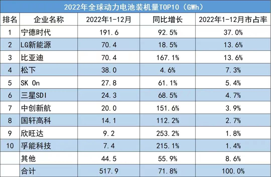 寧德時(shí)代作為我國動(dòng)力電池龍頭企業(yè),現(xiàn)已發(fā)展成為全球最大的動(dòng)力電池廠商。SNE Research數(shù)據(jù)顯示,2022年,寧德時(shí)代以191.6 GWh的裝車量和37%的市占率,連續(xù)8年產(chǎn)銷位居世界第一。除了寧德時(shí)代之外,在全球排名前十的動(dòng)力電企業(yè)中,有六家來自中國,總市占率超過六成。