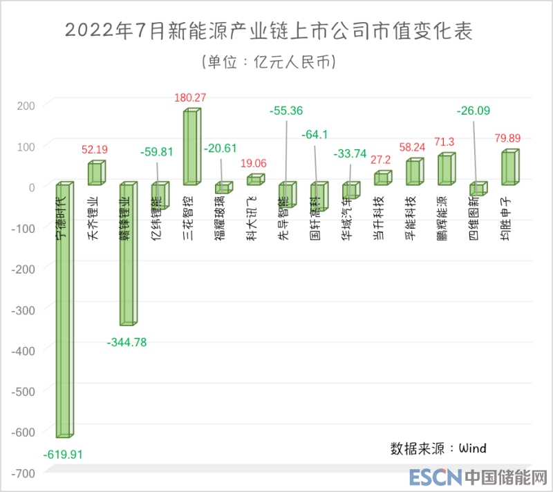 7月,新能源汽車(chē)產(chǎn)業(yè)鏈呈現(xiàn)出“冰火兩重天”的局面。動(dòng)力電池巨頭寧德時(shí)代市值約減少了619.91億元;贛鋒鋰業(yè)(SZ002460,股價(jià)93.81元,市值1892億元)市值減少344.78億元;國(guó)軒高科(SZ002074,股價(jià)42.46元,市值755.3億元)市值減少約64.1億元。