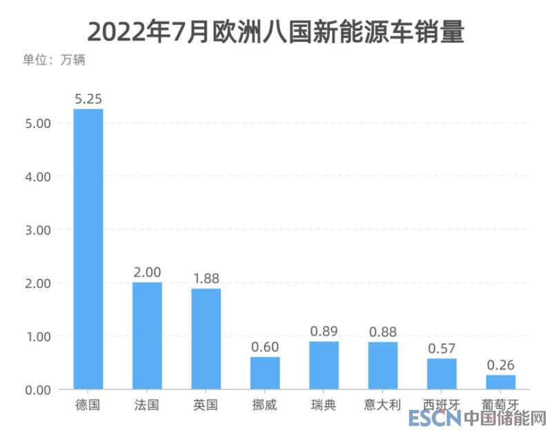 公開(kāi)資料顯示,7月,德國(guó)、法國(guó)、挪威、英國(guó)、瑞典、意大利、西班牙、葡萄牙等八國(guó)純電動(dòng)車(chē)銷(xiāo)量分別為5.25萬(wàn)輛、2.00萬(wàn)輛、0.60萬(wàn)輛、1.88萬(wàn)輛、0.89萬(wàn)輛、0.88萬(wàn)輛、0.57萬(wàn)輛和0.26萬(wàn)輛,合計(jì)銷(xiāo)量約為12.34萬(wàn)輛,同比下滑5.5%,環(huán)比下滑29.1%。