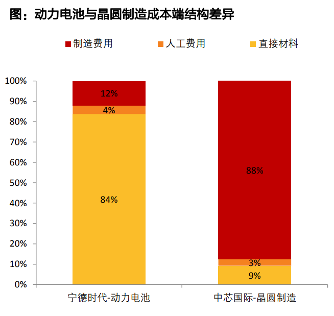 對比同一產(chǎn)業(yè)位置的晶圓制造可以發(fā)現(xiàn),寧德時(shí)代的成本結(jié)構(gòu)中超過80%都是直接材料費(fèi),人工和制造費(fèi)用降低空間極小,而中芯國際的直接材料費(fèi)僅為9%。