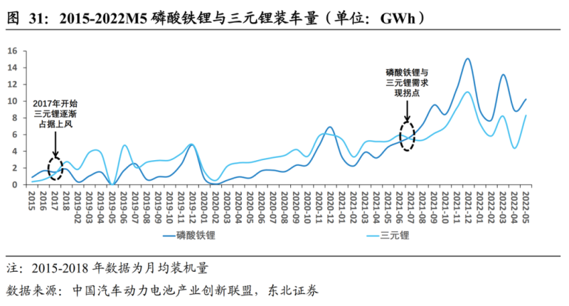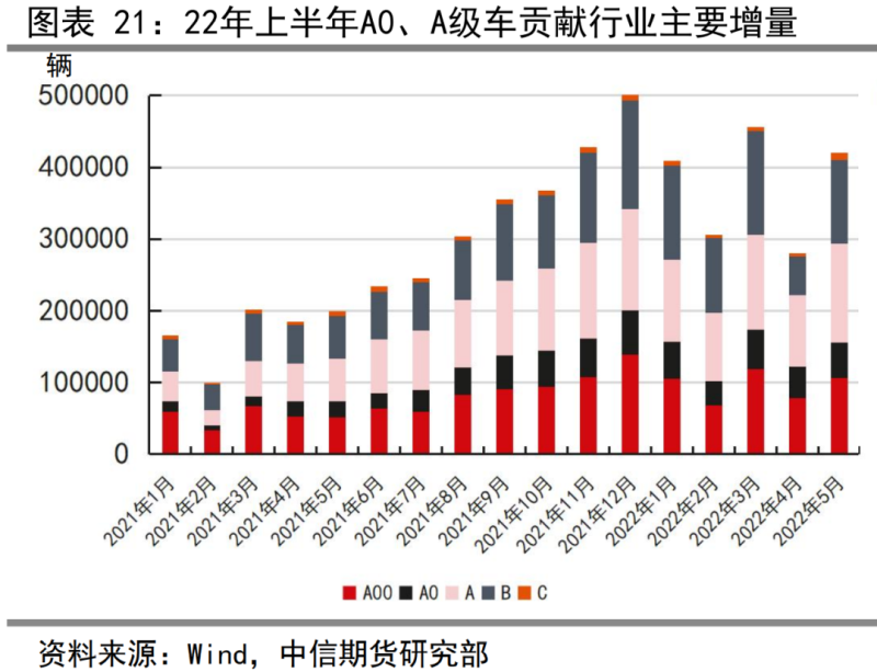 如上圖所示,2022年1-5月,A級車銷58.0萬輛,同比增長157%;B級車銷55.0萬輛,同比增長112%,增速均超過了A00級車。所以,磷酸錳鐵鋰的裝機(jī)量或?qū)O大受益于這一趨勢變化。