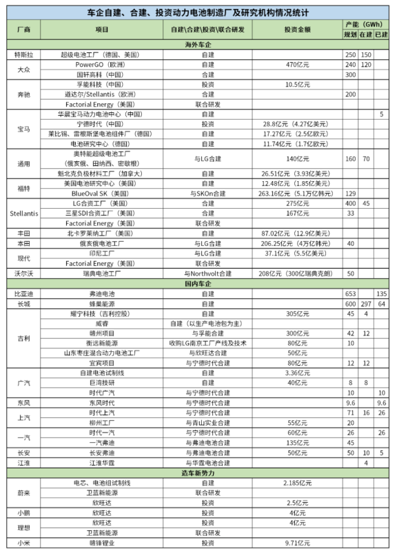 《財(cái)經(jīng)十一人》根據(jù)公開資料整理,車企對(duì)外公開宣布的自建及合資建設(shè)的動(dòng)力電池的產(chǎn)能規(guī)劃已經(jīng)超過3000GWh。這其中肯定有不少項(xiàng)目最終無法達(dá)到規(guī)劃產(chǎn)能,但即便只統(tǒng)計(jì)在建和已建產(chǎn)能,也超過1000GWh。