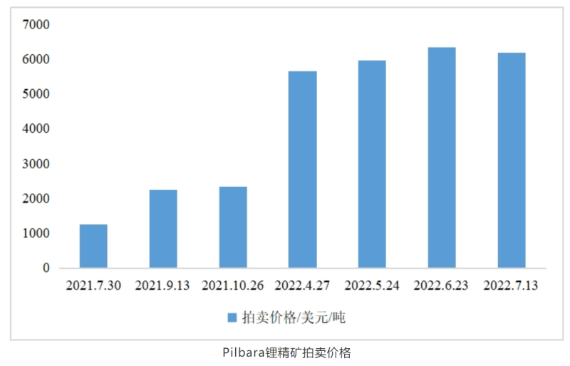 新能源汽車產業(yè)的快速發(fā)展導致鋰電池需求量激增,鋰電礦產資源成為多方爭搶的稀缺資源,鋰價在過去一年已經上漲了490%。根據公開數(shù)據顯示,澳大利亞主力礦商Pilbara(全球鋰精礦價格走勢風向標)自2021年7月30日至2022年的7月13日,共拍賣了7次,鋰輝石精礦從1250美元/噸增長至6188美元/噸。