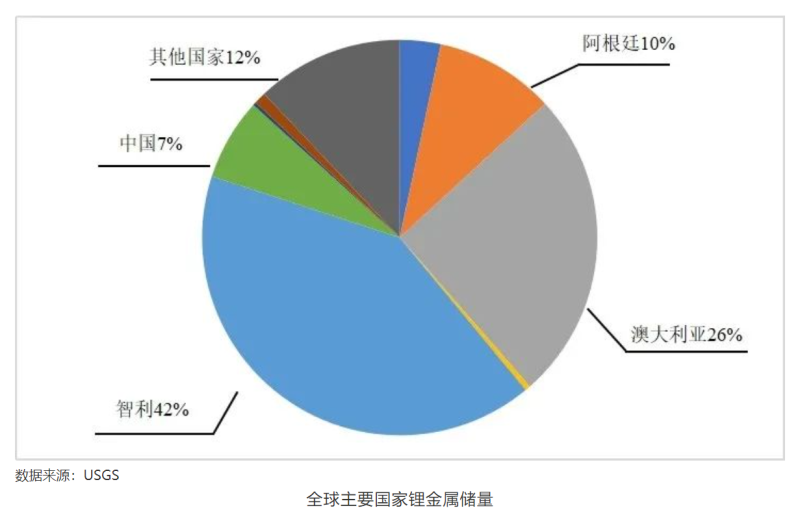 根據美國地質調查局USGS最新公布的數(shù)據顯示,2021年全球鋰金屬總儲量為2200萬噸,其中,智利的鋰金屬儲量最多,為920萬噸,占全球總量的41.8%;澳大利亞的鋰金屬儲量為570萬噸,占全球總量的25.9%;阿根廷的鋰金屬儲量為220萬噸,占全球總量的10%;中國的鋰金屬儲量為150萬噸,占全球總量的6.8%。這四個國家的鋰金屬儲量達到全球總儲量的90%以上,儲量相對集中。