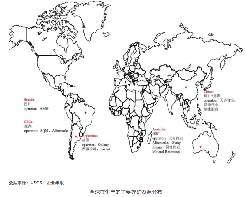 全球在生產的主要鋰礦資源分布