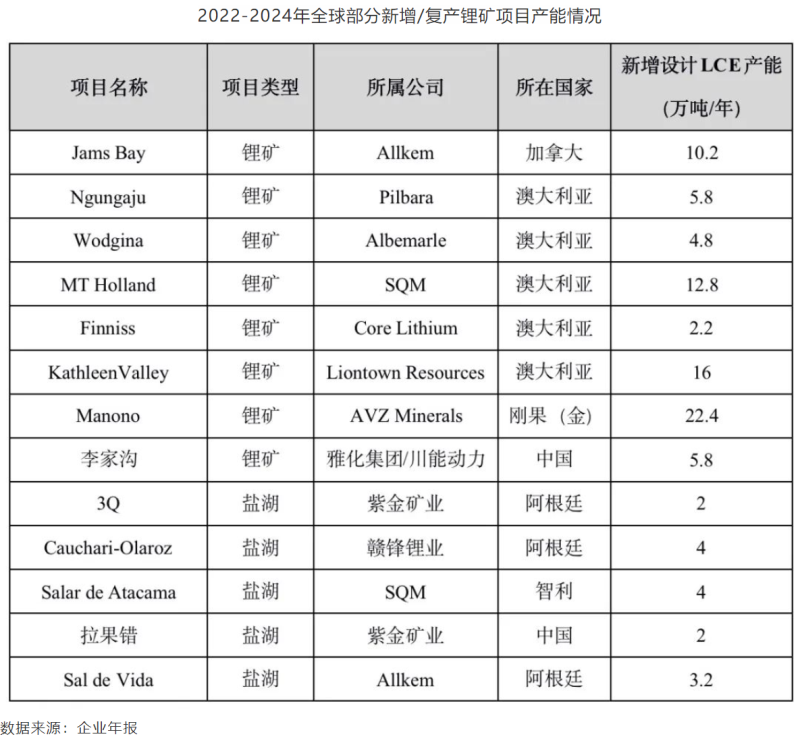 2022-2024年全球部分新增/復產鋰礦項目產能情況