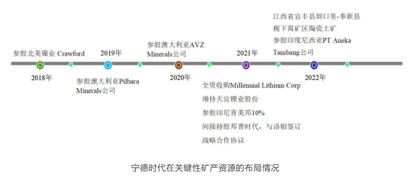 電池生產龍頭企業(yè)寧德時代,自2018年開始布局國內外的關鍵性資源。具體的布局情況如圖所示。