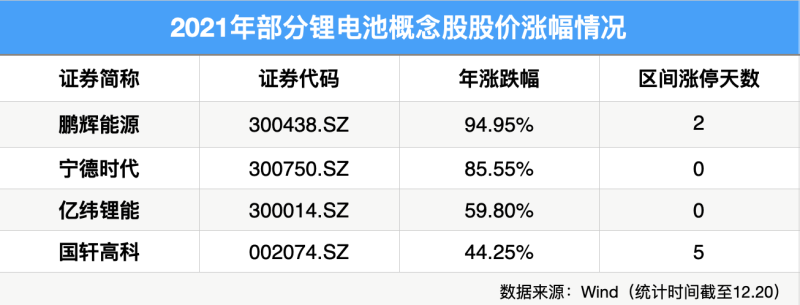 具體到個股方面,截至12月20日收盤,寧德時代股價年內(nèi)漲幅達85.55%;億緯鋰能(300014.SZ)股價年內(nèi)漲幅達59.80%;國軒高科(002074.SZ)股價年內(nèi)漲幅達44.25%;鵬輝能源(300438.SZ)股價年內(nèi)漲幅達94.95%。