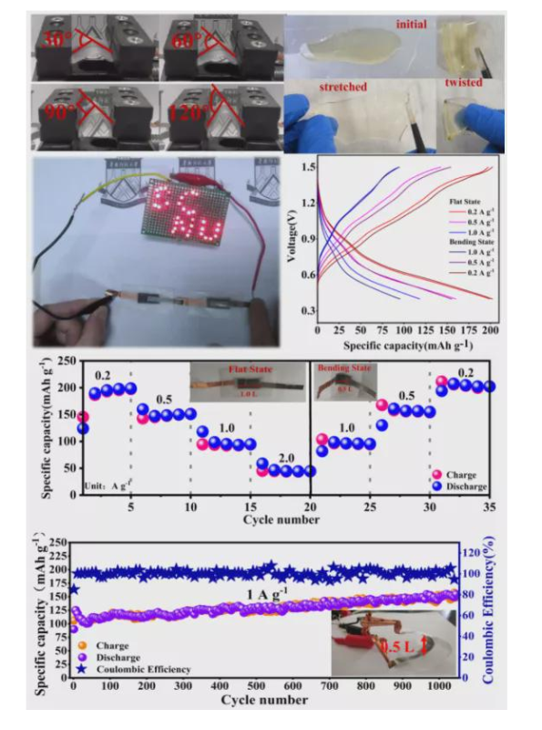 本研究工作通過一步水熱法合成了雙相釩基正極材料K0.5V2O5/NaV3O8,得益于更多活性位點的存在和雙相的協(xié)同作用,該正極材料的贗電容貢獻率和反應(yīng)動力學(xué)具有明顯的優(yōu)勢,具體表現(xiàn)為電池比容量的有效提高和循環(huán)壽命的顯著增長。此外,作者以明膠為主體合成了柔韌性良好的凝膠聚合物電解質(zhì),結(jié)合碳布、鋅片組裝了具有三明治式結(jié)構(gòu)的柔性準固態(tài)電池。該電池在不同彎曲角度(30°、60°、90°和120°)下無任何破損,展現(xiàn)出了較好的可彎曲性能和耐用性。與正常未彎曲情況相比,大角度彎曲(120°)下的電池的充放電容量未有明顯下降,倍率性能(在不同電流密度循環(huán)25圈后,0.2 A/g下的放電容量由198.8 mAh g降為193.9 mAh/g,容量保持率為97.5%)和循環(huán)穩(wěn)定性良好(在1.0 A/g下循環(huán)1050次后,放電容量穩(wěn)定在138.4 mAh/g,且?guī)靵鲂适冀K保持在100%),在柔性電子領(lǐng)域具有廣闊的應(yīng)用前景。這一研究對儲能材料和凝膠電解質(zhì)的設(shè)計合成具有一定的借鑒意義。