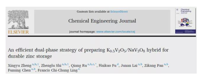 中國儲能網(wǎng)訊:近日,華南師范大學(xué)物理與電信工程學(xué)院汝強指導(dǎo)2018級材料物理本科生鄭興宇在《Chemical Engineering Journal》(中科院工程技術(shù)類Ⅰ區(qū),2020年影響因子13.273)發(fā)表題為《An Efficient Dual-phase Strategy Of Preparing K0.5V2O5/NaV3O8 Hybrid For Durable Zinc Storage》的一作論文,2018級碩士研究生石正祿為共同一作,我校為第一完成單位。