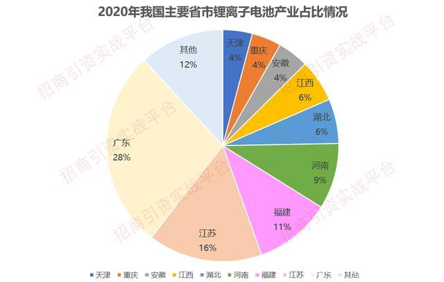 我國鋰離子電池產(chǎn)業(yè)主要分布在珠三角、長三角、京津冀以及川渝等地區(qū),已形成了明顯的鋰電池產(chǎn)業(yè)集群。目前,鋰電池產(chǎn)能主要集中在廣東、江蘇、福建三省,2020年總產(chǎn)量占比達到全國的51%左右。其中,廣東鋰離子電池產(chǎn)量達到 49.5 億只,占比26.2%,居全國首位。