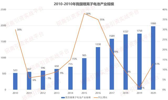 隨著產(chǎn)量增速的明顯提升,2020 年我國鋰離子電池產(chǎn)業(yè)規(guī)模達到了 1980 億元,同比增長 13%。
