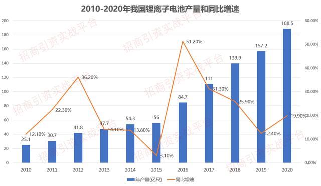 受益于新能源汽車,消費電子、電動自行車規(guī)模不斷擴大,對鋰電池產(chǎn)量需求不斷增加,我國鋰電池產(chǎn)量呈現(xiàn)加速增長態(tài)勢。2020 年我國鋰離子產(chǎn)量創(chuàng)歷史新高,達到了 188.5 億只,同比增長 19.9%。