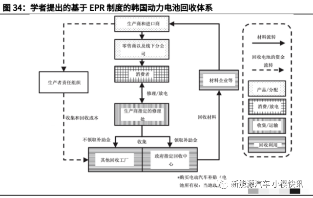 有鑒于此,有韓國學者也提出基于 EPR 制度的適用于韓國可行的動力電池回收 體系,在該回收體系中,電池生產(chǎn)者成立生產(chǎn)者責任組織以統(tǒng)籌安排回收動力電 池的相關費用,并且政府通過補助金形式促進消費者將電池轉(zhuǎn)交給政府指定回收中心,材料企業(yè)通過拆解回收獲得金屬并流轉(zhuǎn)回生產(chǎn)商或進口商,從而形成電池回收的良好循環(huán)。值得注意的是,在韓國的動力電池回收體系建立中,也有中國公司的身影,例如,格林美在 2019 年 10 月與韓國浦項市政府、ECOPRO,就 新能源汽車電池梯次利用及循環(huán)再生項目推進,簽署諒解備忘錄。