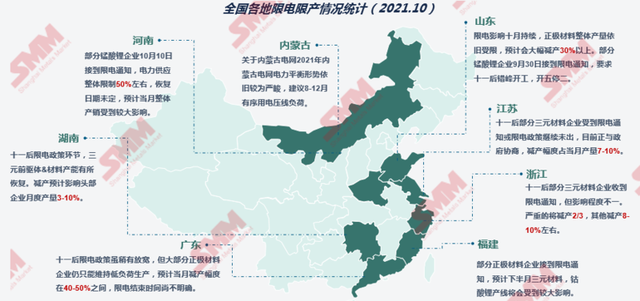 此外,今年下半年以來,全國多地下發(fā)能耗雙控文件,一些耗能大、污染大的行業(yè)紛紛停產(chǎn)停工,其中鋰電行業(yè)各材料生產(chǎn)也均受到限產(chǎn)影響。
