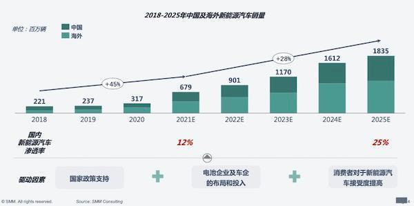 2021年,全球新能源汽車預(yù)計(jì)總銷量為680萬輛,同比增長近115%,其中,中國預(yù)計(jì)全年銷量為300萬輛,滲透率將達(dá)12%。到2025年,機(jī)構(gòu)預(yù)計(jì)國內(nèi)新能源汽車滲透率有望提升至25%。