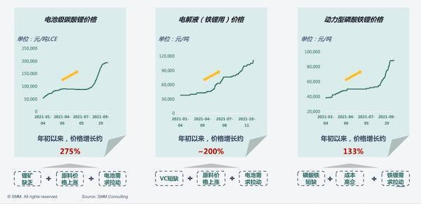 近日,在由上海期貨交易所和上海有色金屬網(wǎng)(SMM)共同舉辦的2021年有色金屬行業(yè)年會(huì)上,鋰電產(chǎn)業(yè)鏈企業(yè)人士齊聚,探討漲價(jià)潮下的應(yīng)對方式和行業(yè)未來發(fā)展方向。SMM新能源研究咨詢總監(jiān)易彥婷對記者表示,受新能源車滲透率提升、電池需求拉動(dòng),鋰電各材料的需求量、價(jià)格均大幅增長。2021年初至今,鋰電池各大主材大幅漲價(jià),碳酸鋰價(jià)格上漲約275%,正負(fù)極、隔膜、電解液價(jià)格上漲普遍為50~500%。隨著新能源行業(yè)由粗放增長逐步邁入供需平衡的階段,如何定價(jià)、穩(wěn)定供應(yīng)鏈成為全產(chǎn)業(yè)鏈的焦點(diǎn)。