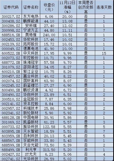 表:11月12日漲幅居前的鋰電池概念股一覽