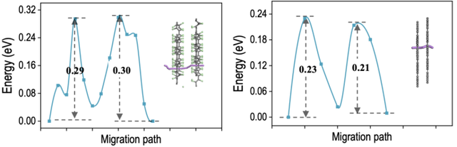 導(dǎo)鋰能力是決定鋰電池性能的關(guān)鍵參數(shù)之一。在負(fù)極加上氯化石墨炔薄膜后,導(dǎo)鋰情況如何呢?羅光富團(tuán)隊(duì)利用過渡態(tài)計(jì)算方法對(duì)比了單個(gè)鋰離子穿過氯化石墨炔和純石墨炔的勢(shì)能圖。結(jié)果顯示鋰離子通過氯化石墨炔的能壘為 0.30eV ,僅比通過純石墨炔時(shí) 0.23eV 的勢(shì)壘略微增高,仍屬于導(dǎo)鋰能力很好的材料。