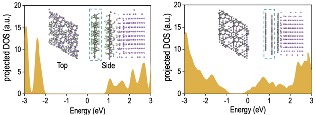 通過氯化石墨炔與鋰金屬直接接觸的計(jì)算發(fā)現(xiàn),氯化石墨炔的確可以顯著增強(qiáng)對(duì)鋰金屬的抵抗能力,更難被金屬化。下圖中左側(cè)是氯化石墨炔和鋰金屬接觸后的投影態(tài)密度圖,右側(cè)是純石墨炔和鋰金屬接觸后的情況。通過對(duì)比可以看到,與鋰金屬無直接接觸的氯化石墨炔保持了絕緣體性質(zhì),而純石墨炔則出現(xiàn)了金屬化現(xiàn)象。