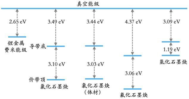 圖丨氫化、氟化、氯化石墨炔的帶邊相對(duì)鋰金屬費(fèi)米能級(jí)的分布圖(來源:羅光富,絡(luò)繹知圖整理)