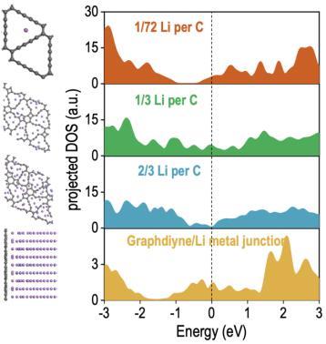 圖丨石墨炔和不同量的鋰原子接觸時(shí),碳元素的投影態(tài)密度圖(來源:羅光富,絡(luò)繹知圖整理)