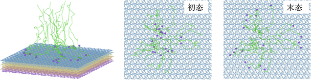 為進(jìn)一步解釋石墨炔令鋰離子均勻分布的作用原理,羅光富團(tuán)隊(duì)分析了石墨炔薄膜上方鋰離子的運(yùn)動(dòng)軌跡。下圖中最左邊是側(cè)視圖,其中的層狀結(jié)構(gòu)是石墨炔薄膜,紫色球是鋰離子,綠線是鋰離子的運(yùn)動(dòng)軌跡。右邊兩幅圖是從俯視角度看鋰離子的初始狀態(tài)和接觸石墨炔后的狀態(tài)。可以清楚地看到,鋰離子最初集中在中間的高電場(chǎng)區(qū)域,但在接觸石墨炔后分散開了。