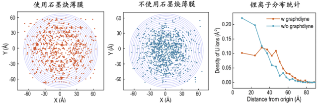 進(jìn)一步的統(tǒng)計(jì)分析可以看出,使用石墨炔薄膜后,鋰離子分布在約 5nm 的半徑內(nèi)都很均勻。如果按照鋰離子濃度降低一半前所覆蓋的面積來計(jì)算,石墨炔使鋰離子均勻分布的能力是不使用石墨炔時(shí)的 3.5 倍。因此,石墨炔可以在非均勻電場(chǎng)下高效地使鋰離子均勻分布。