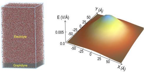 為探究石墨炔抑制鋰枝晶的微觀機(jī)制,羅光富團(tuán)隊(duì)采用了經(jīng)典分子學(xué)動(dòng)力學(xué)模擬方法,研究了包含電解液分子和石墨炔薄膜在內(nèi)共約 38 萬個(gè)原子的模型。為了模擬導(dǎo)致鋰枝晶生長的多種因素,如集流體上的微觀突起、鋰金屬上的初始鋰枝晶,團(tuán)隊(duì)在模擬中采用了非均勻電場(chǎng),然后觀察穿過模型底部的鋰離子分布情況。