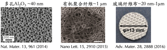 通過使用多孔材料使鋰離子均勻分布,進(jìn)而令鋰金屬沉積更均勻的方法也有諸多嘗試。例如,多孔 AlO、有機(jī)聚合纖維、玻璃纖維布材料以及石墨炔薄膜 [ Mater. Today Energy 10, 191 ( 2018 ) ] 都被用于抑制鋰枝晶。