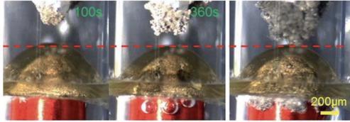 上述現(xiàn)象與流體力學(xué)中的“水躍”非常相似。日常生活中最常見的水躍現(xiàn)象之一便是水龍頭放水時(shí),水接觸水池底部后的狀態(tài)。石墨炔薄膜的應(yīng)用使得負(fù)極上方的鋰離子運(yùn)動(dòng)出現(xiàn)類似的“水躍”現(xiàn)象,進(jìn)而使得鋰離子更均勻的分布,這些鋰離子最終通過石墨炔擴(kuò)散至集流體,生成鋰金屬。當(dāng)電場(chǎng)越大時(shí),“水躍”現(xiàn)象越明顯,這恰恰打破了鋰枝晶生長中原有的正反饋效應(yīng)。