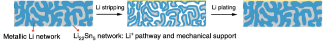 2020 年,斯坦福大學(xué)崔屹課題組通過壓延和反復(fù)折疊制備了三維互穿網(wǎng)絡(luò)結(jié)構(gòu)的 Li/Li22Sn5金屬鋰負(fù)極。在這個(gè)網(wǎng)絡(luò)結(jié)構(gòu)中,三維金屬 Li 和 Li22Sn5網(wǎng)絡(luò)之間的強(qiáng)親和力及其豐富的界面使界面阻抗變小,使得金屬鋰原子在負(fù)極材料中擴(kuò)散更快,以此來減弱鋰枝晶的生長。