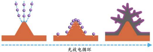 鋰枝晶形成的主要原因是局部電流密度大于局域鋰離子的輸運(yùn)能力。在電流密度很大的情況下,受限于鋰離子的濃度和擴(kuò)散速度,鋰離子在負(fù)極出現(xiàn)分布不均,進(jìn)而導(dǎo)致鋰金屬生長不均勻。更甚的是,鋰枝晶的生長過程還會(huì)出現(xiàn)正反饋效應(yīng)。這是因?yàn)殇囍Ц浇泻軓?qiáng)的電場(chǎng),會(huì)吸引更多的鋰離子,循環(huán)往復(fù),導(dǎo)致鋰枝晶更快地生長(如下圖)。