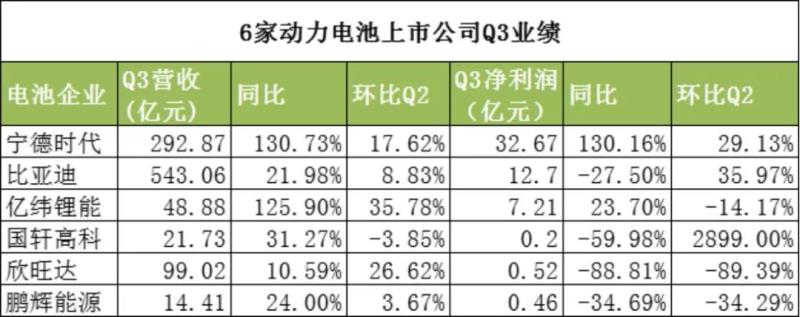 6家動(dòng)力電池上市公司披露Q3業(yè)績(jī),僅寧德時(shí)代、億緯鋰能兩家營(yíng)收、凈利雙增,其余4家利潤(rùn)同比均出現(xiàn)了不同程度的下降,其中1家環(huán)比Q2下降近9成。