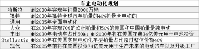 根據(jù)規(guī)劃,特斯拉到2030年實(shí)現(xiàn)年銷量2000萬(wàn)輛;通用計(jì)劃到2035年實(shí)現(xiàn)全面電動(dòng)化;到2030年,福特計(jì)劃電動(dòng)車滲透率40%;大眾計(jì)劃在美國(guó)實(shí)現(xiàn)50%的純電動(dòng)銷量,Stellantis在美國(guó)電動(dòng)化車型銷量占比超過(guò)40%。