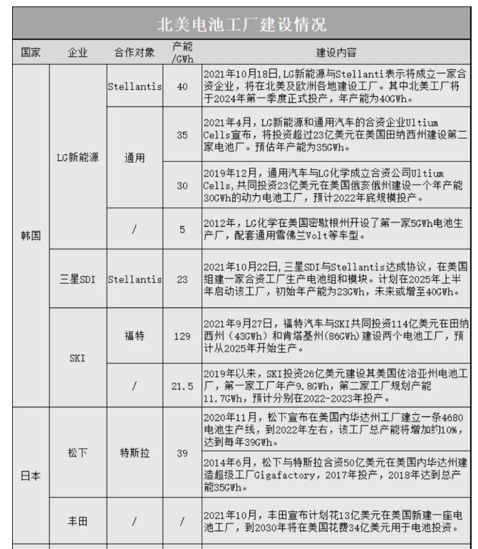 三星SDI宣布與Stellantis將在美國(guó)組建一家合資工廠,初始年產(chǎn)能為23GWh,未來(lái)或增至40GWh;LG新能源與Stellantis將成立一家合資企業(yè)在北美建設(shè)年產(chǎn)能為40GWh的工廠;SKI與福特汽車將在美國(guó)建設(shè)兩個(gè)合計(jì)產(chǎn)能達(dá)129GWh的電池工廠。