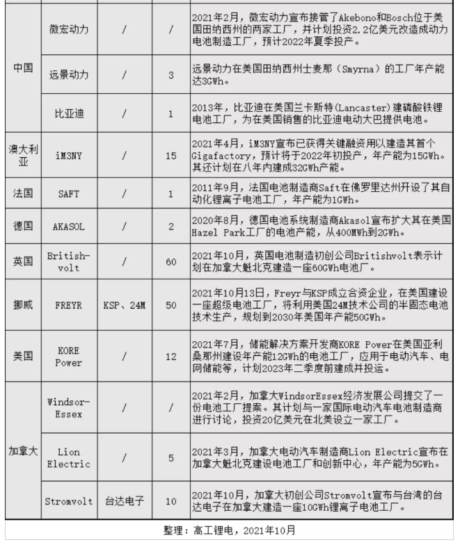 可供對(duì)比的是,截止2021年3月的數(shù)據(jù)是,美國(guó)電池制造能力僅為59GWh。僅半年的時(shí)間,全球電池企業(yè)和車企集體奔赴北美建造“超級(jí)工廠”,讓一度“萎縮”的北美電池圈開(kāi)始“膨脹”。