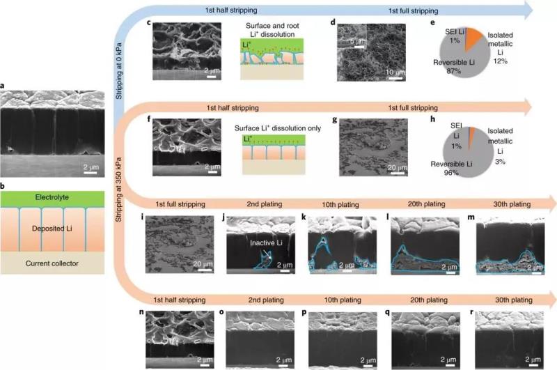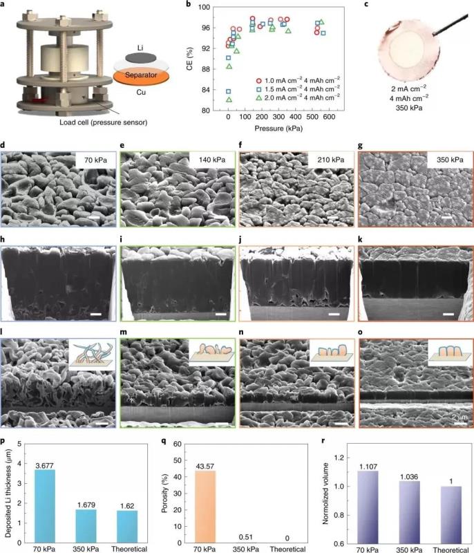 實(shí)驗很簡單,首先在不同壓力下進(jìn)行鋰金屬電化學(xué)沉積,實(shí)際上這對應(yīng)的是電池中的充電過程,接著再對這些沉積的鋰金屬樣品進(jìn)行橫截面形貌分析。然后她發(fā)現(xiàn),在壓力一步步優(yōu)化的過程中,鋰金屬在電化學(xué)沉積過程中的生長方向,可以被壓力改變,借此可在最優(yōu)條件下形成完美、且致密的柱狀結(jié)構(gòu)。最優(yōu)壓力大約為350 kPa,這遠(yuǎn)遠(yuǎn)小于鋰金屬244 MPa的屈服強(qiáng)度,這表明鋰金屬并不是在壓力作用下發(fā)生的變形,也意味著只需三到四個大氣壓壓力,即可在工業(yè)上有效控制鋰金屬的致密生長。